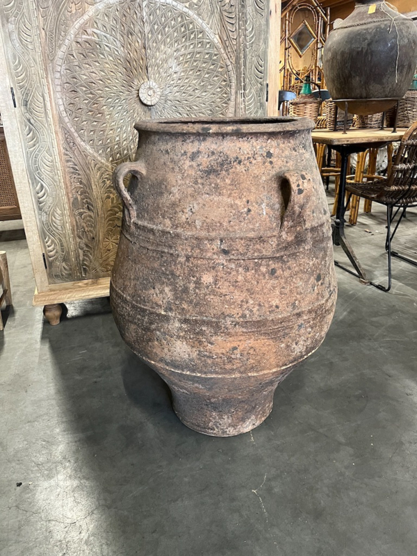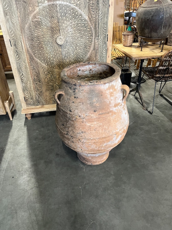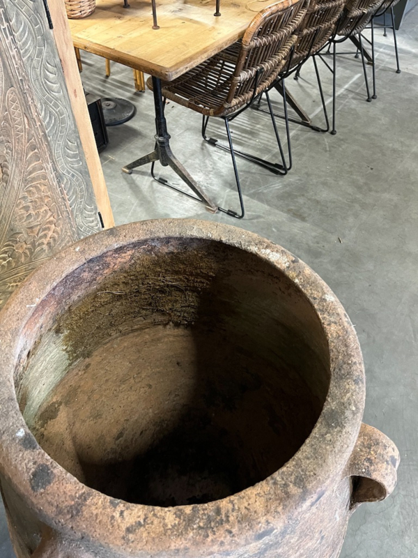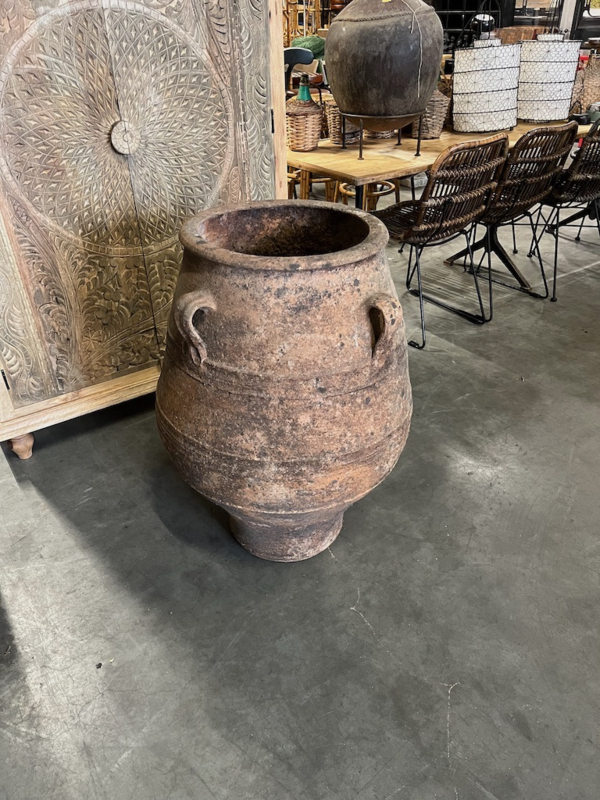 OverzichtZeer unieke Grote Spaanse kruik van Terracotta gemaakt, datering 18e eeuw, echt een zeer zeldzaam en uniek exemplaar. De afmetingen zijn: 91 cm hoog, en de diameter is 65 cm, diameter opening bovenzijde 35 cm.