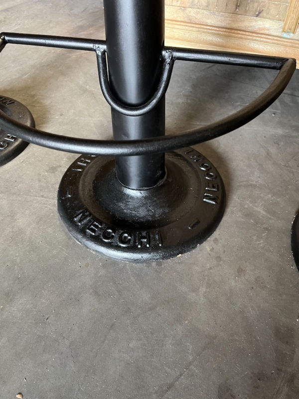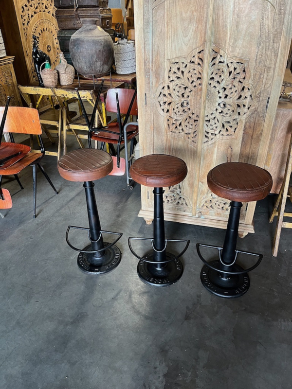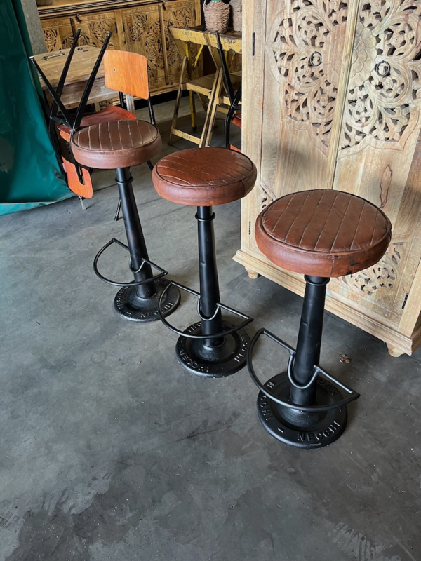 OverzichtIndustriele/vintage barkrukken Necchi. Metalen onderstel met leren zitting in de kleur Cognac. De hoogte per barkruk met leren zitting is 78 cm.
