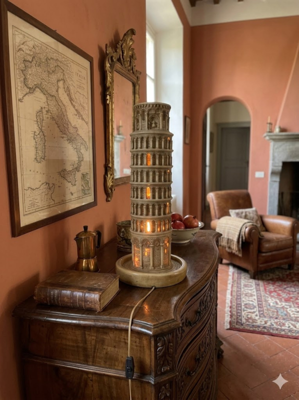 Zeer unieke en grote antieke Toren van Pisa uit Italie gemaakt van Albast. Oud exemplaar was destijds een souvenier welke door rijke mensen werd meegenomen op hun reis. Hoogte is 56 cm.